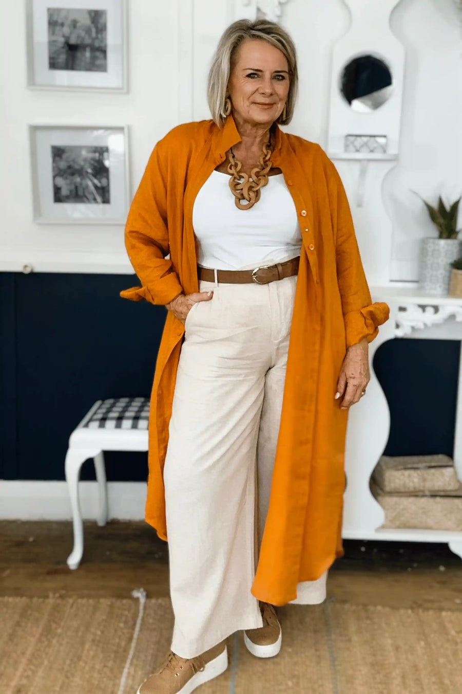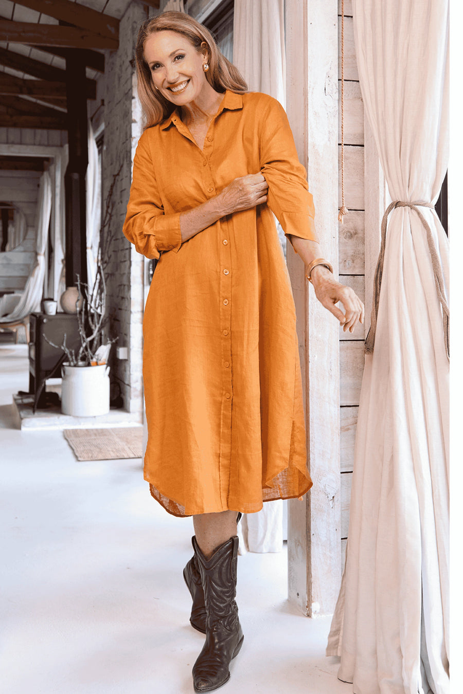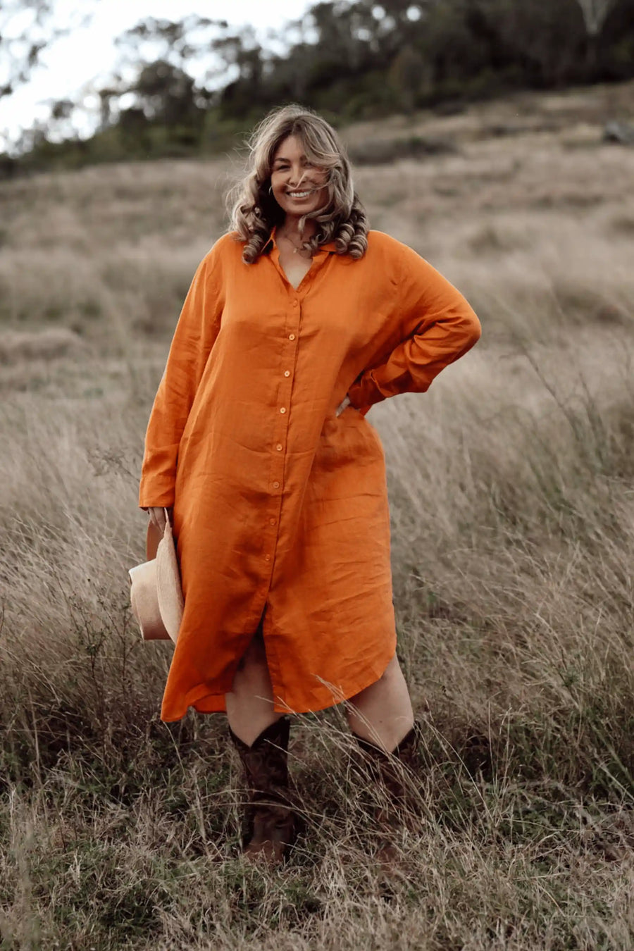 Cut from premium organic linen in our signature Rust tone, this button-down shirt dress is lightweight, breathable, and designed for everyday wear. The warm, earthy colour is inspired by Australia’s red dirt landscapes chosen for its versatility across seasons and settings. With long sleeves, functional buttons, practical pockets, and an easy, flattering shape, it’s made to be worn loose, belted, or layered open over pants. Comfortable in the heat and simple to style, this is a wardrobe staple you’ll reach for again and again, wherever the day takes you.