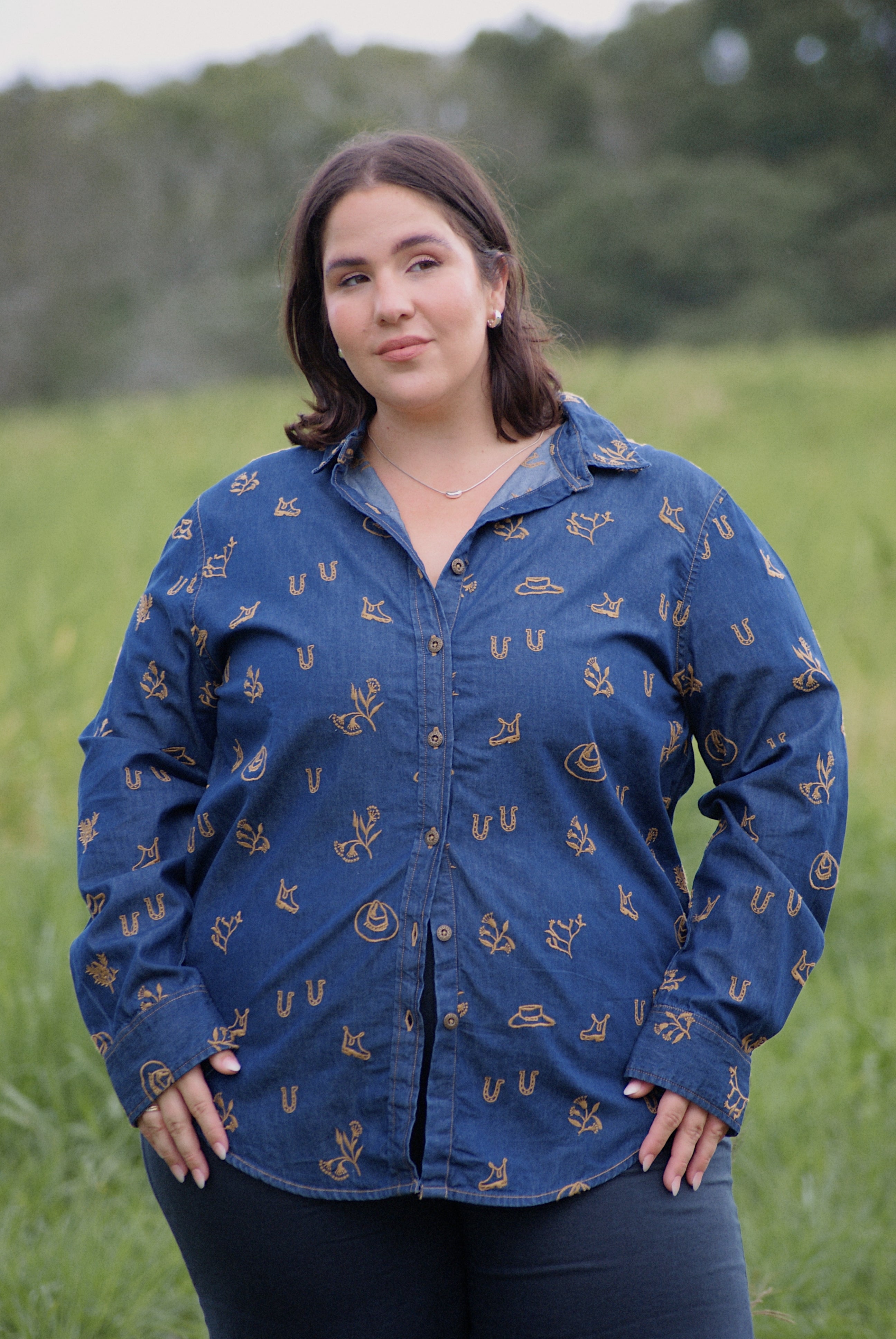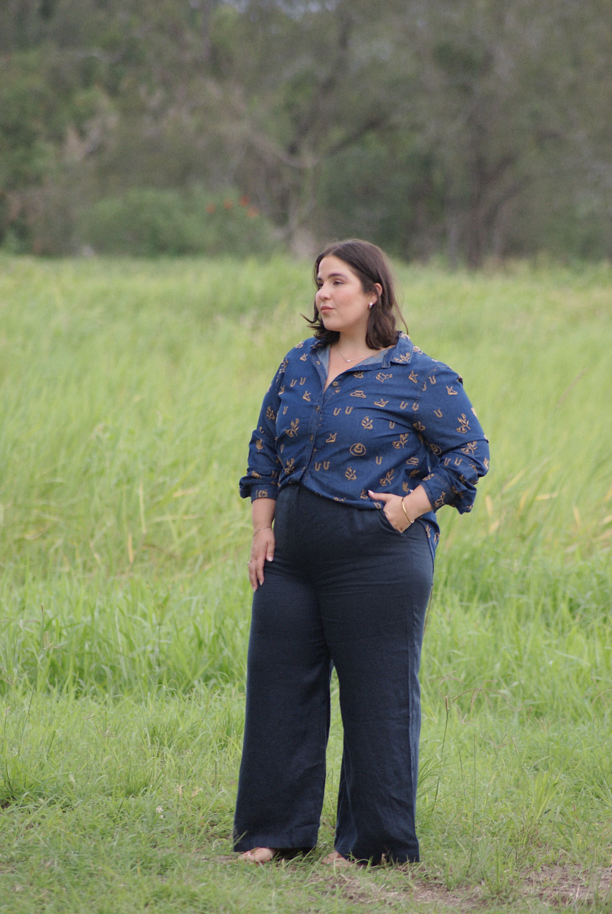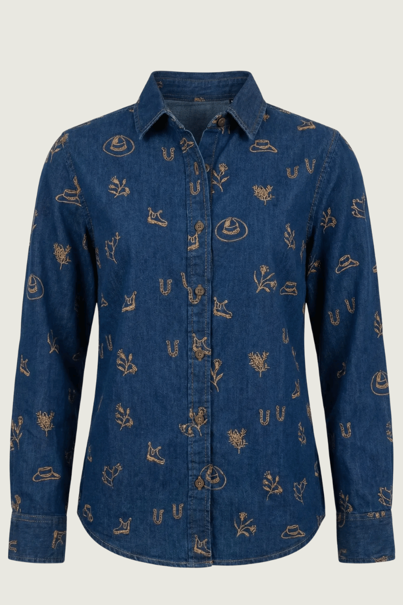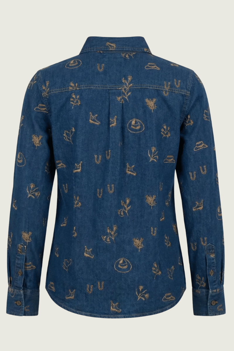 The Dark Denim Lady Jane Shirt is bold, timeless, and quietly powerful... just like the women who wear her. Made from premium denim in a rich, inky indigo shade and detailed with warm golden embroidery, she’s equal parts classic and contemporary.