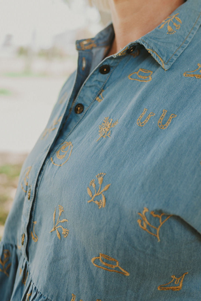 The Lady Jane Embroidered Denim Dress was made for the woman who lives with heart from dusty mornings to long lunches and late-night country tunes.