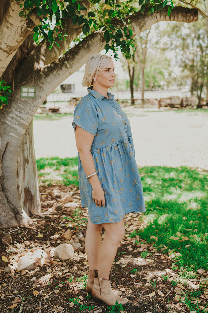 This is Lady Jane: a short sleeve denim dress stitched with story and built for real life. From sun-drenched days to slow evenings under the stars, she moves with you... easy, elegant, and effortlessly elevated.