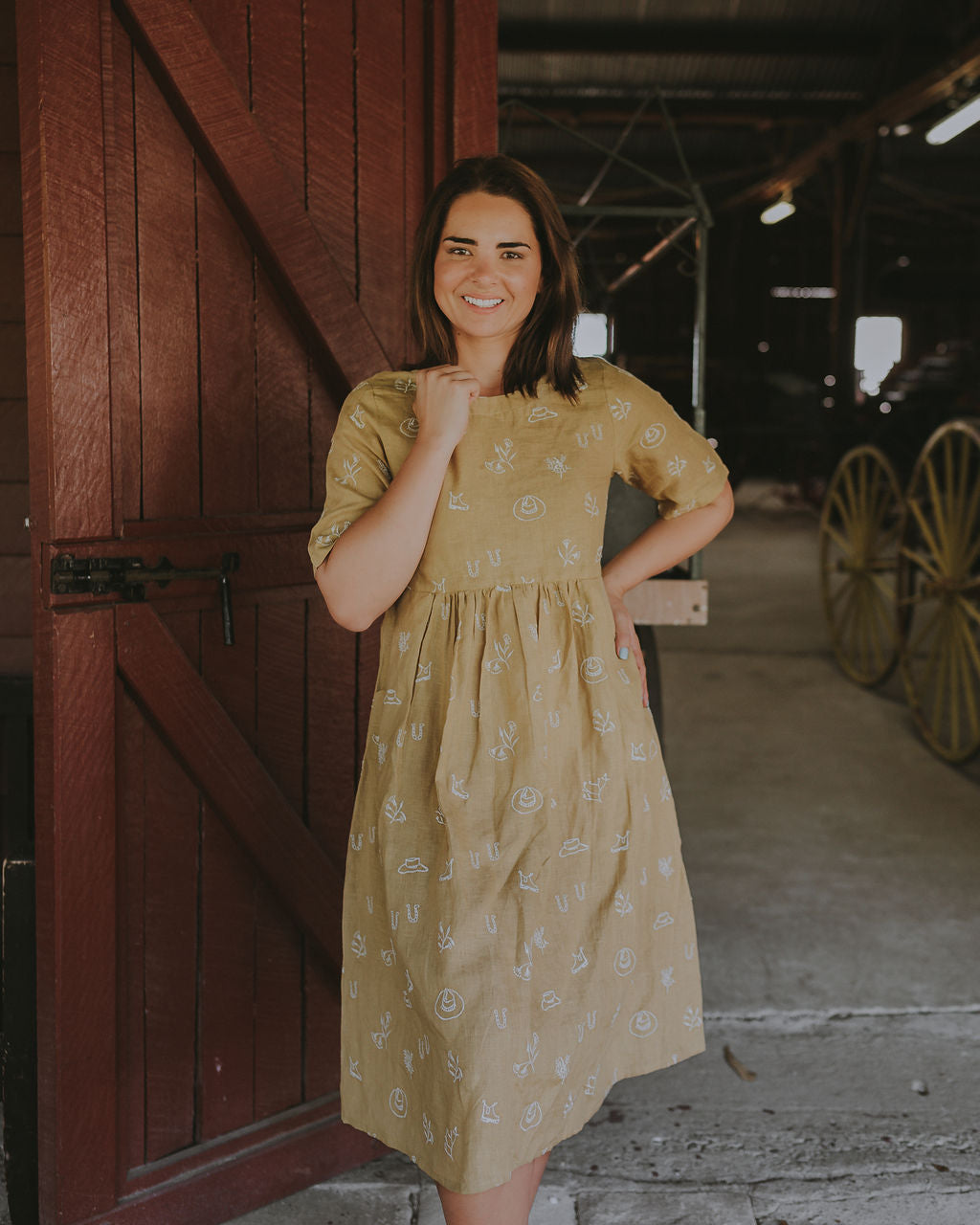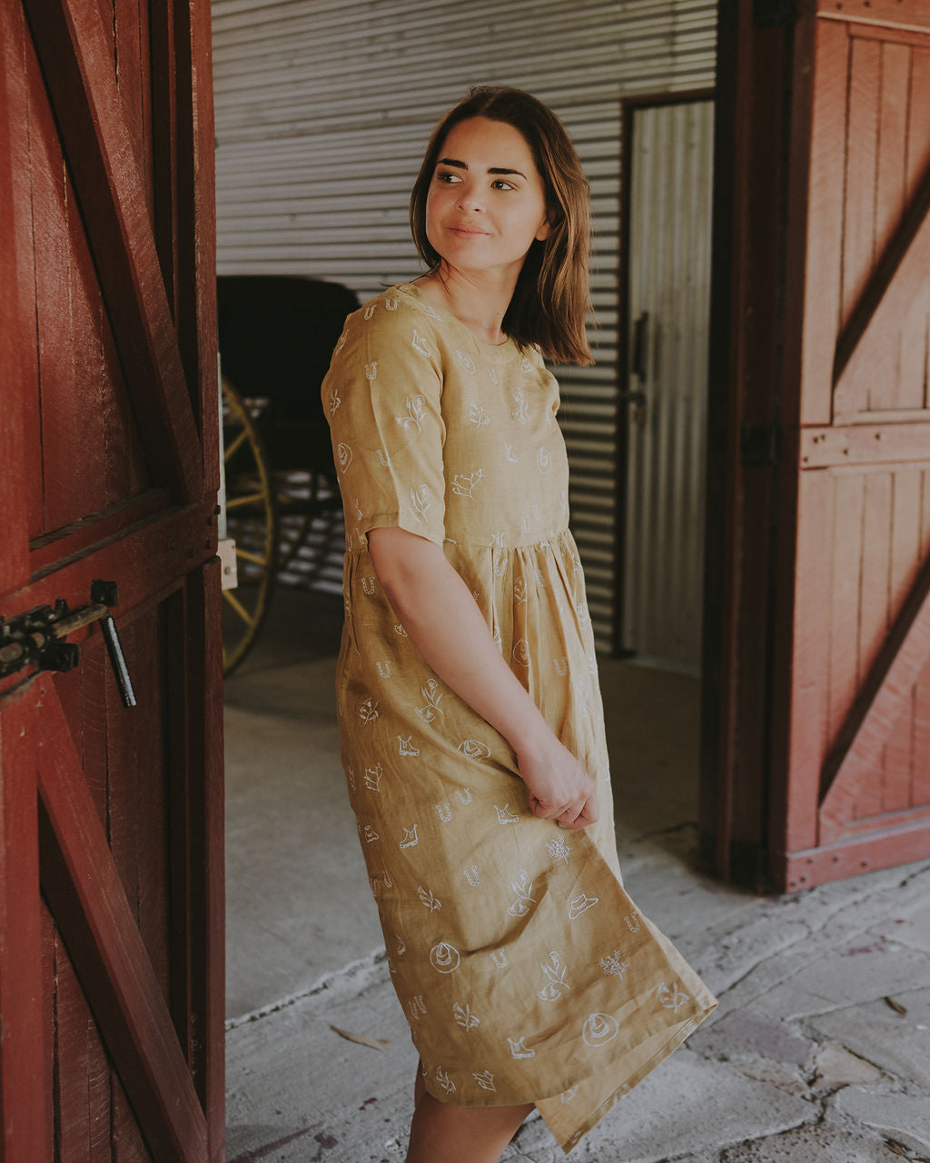The Rural Outback Short Sleeve Organic Linen Dress blends timeless style with thoughtful craftsmanship. Inspired by the stillness of the Australian landscape, the delicate embroidery, featuring windmills, horses, and quiet rural motifs, adds meaning and artistry to an otherwise effortless silhouette.