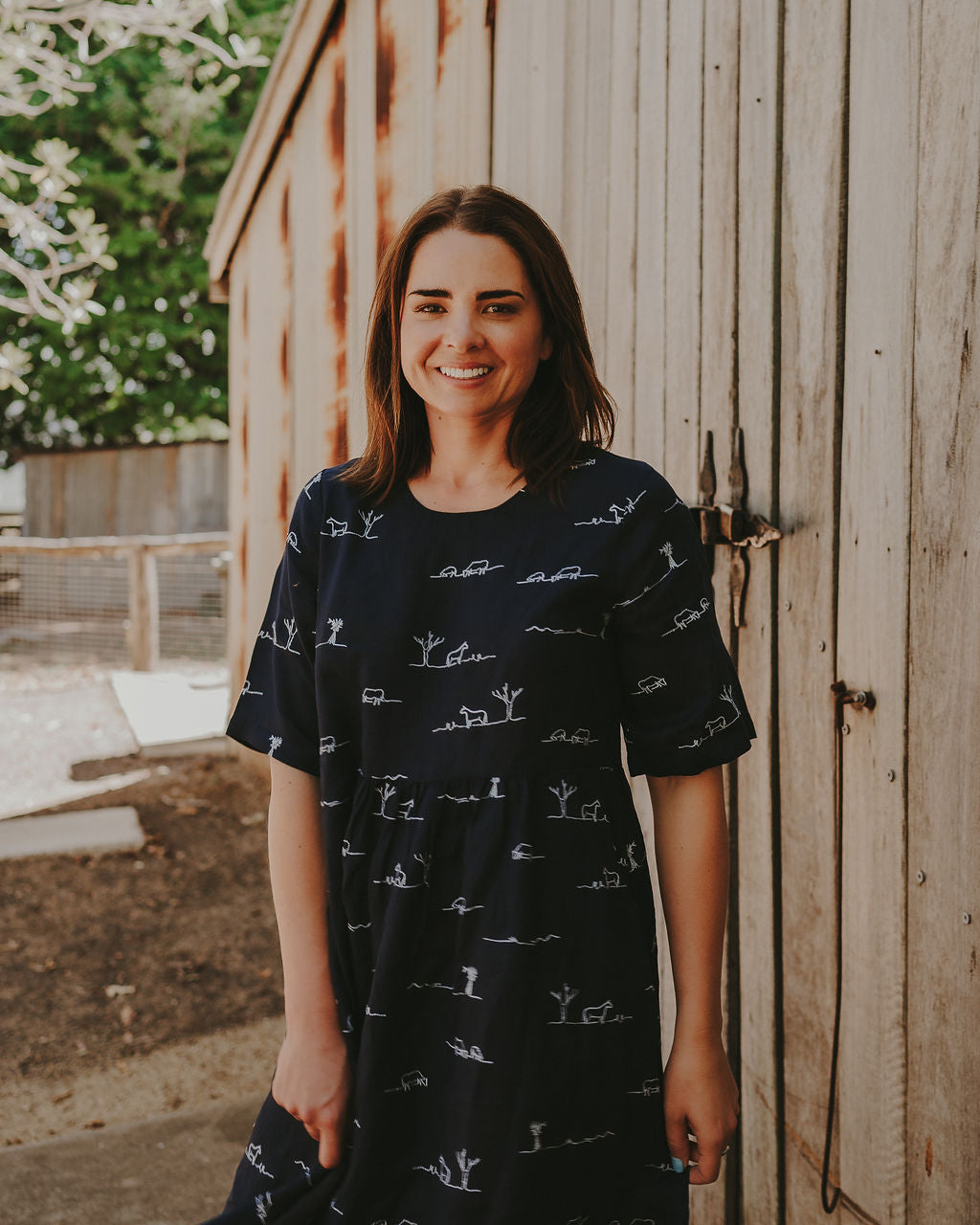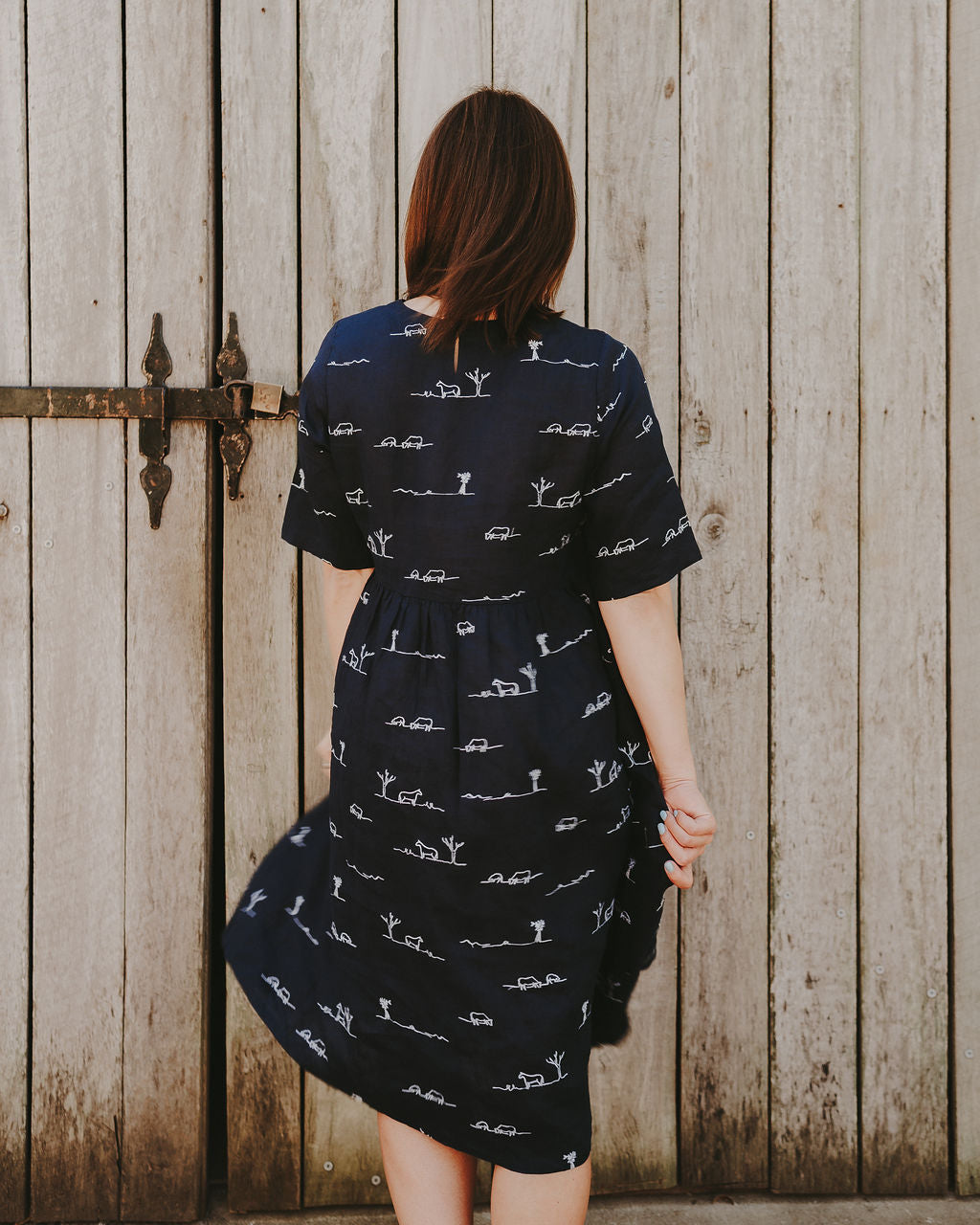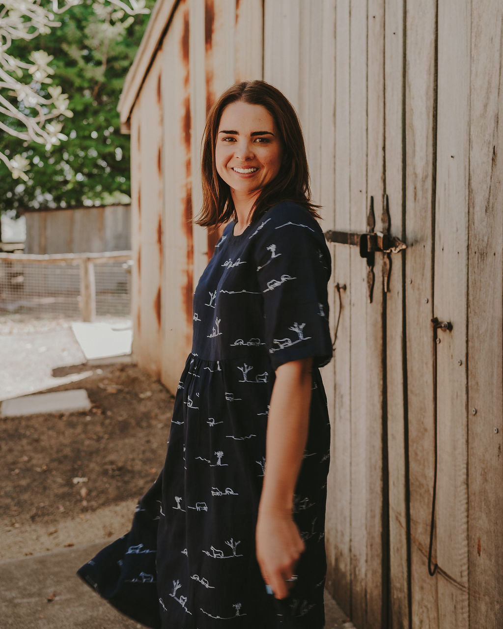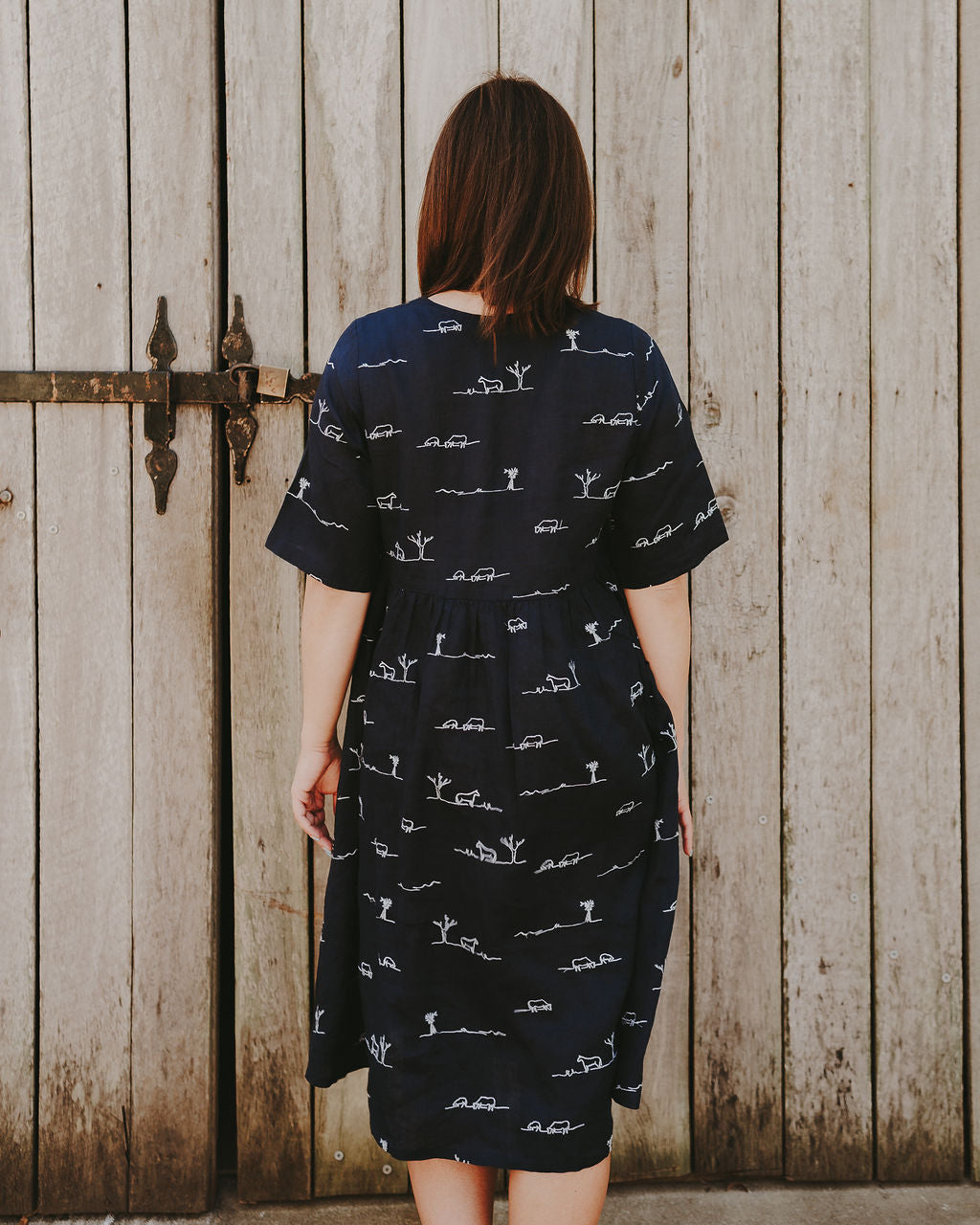 Rural Outback Eclipse Navy Embroidered Organic Linen Short Sleeve Dress