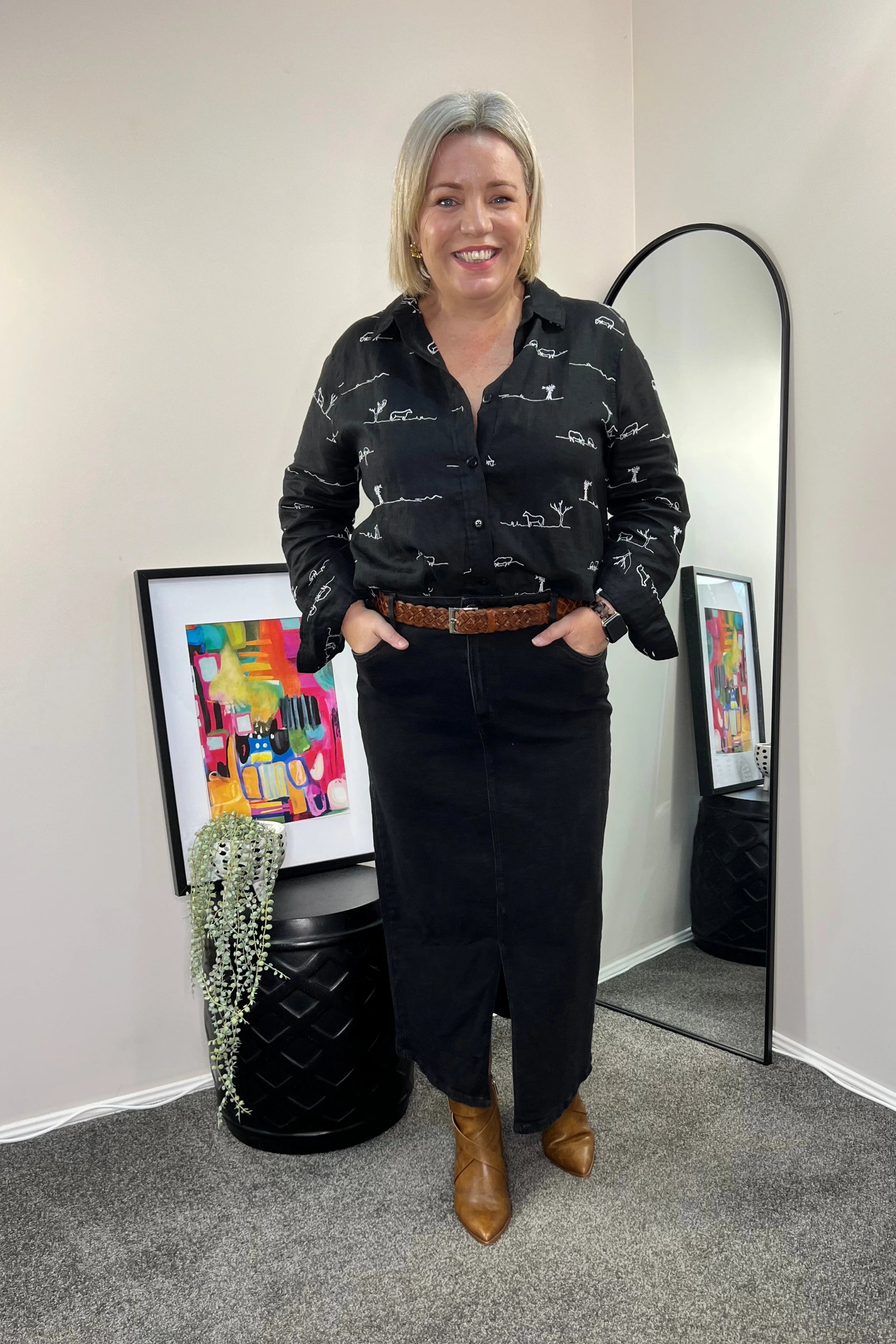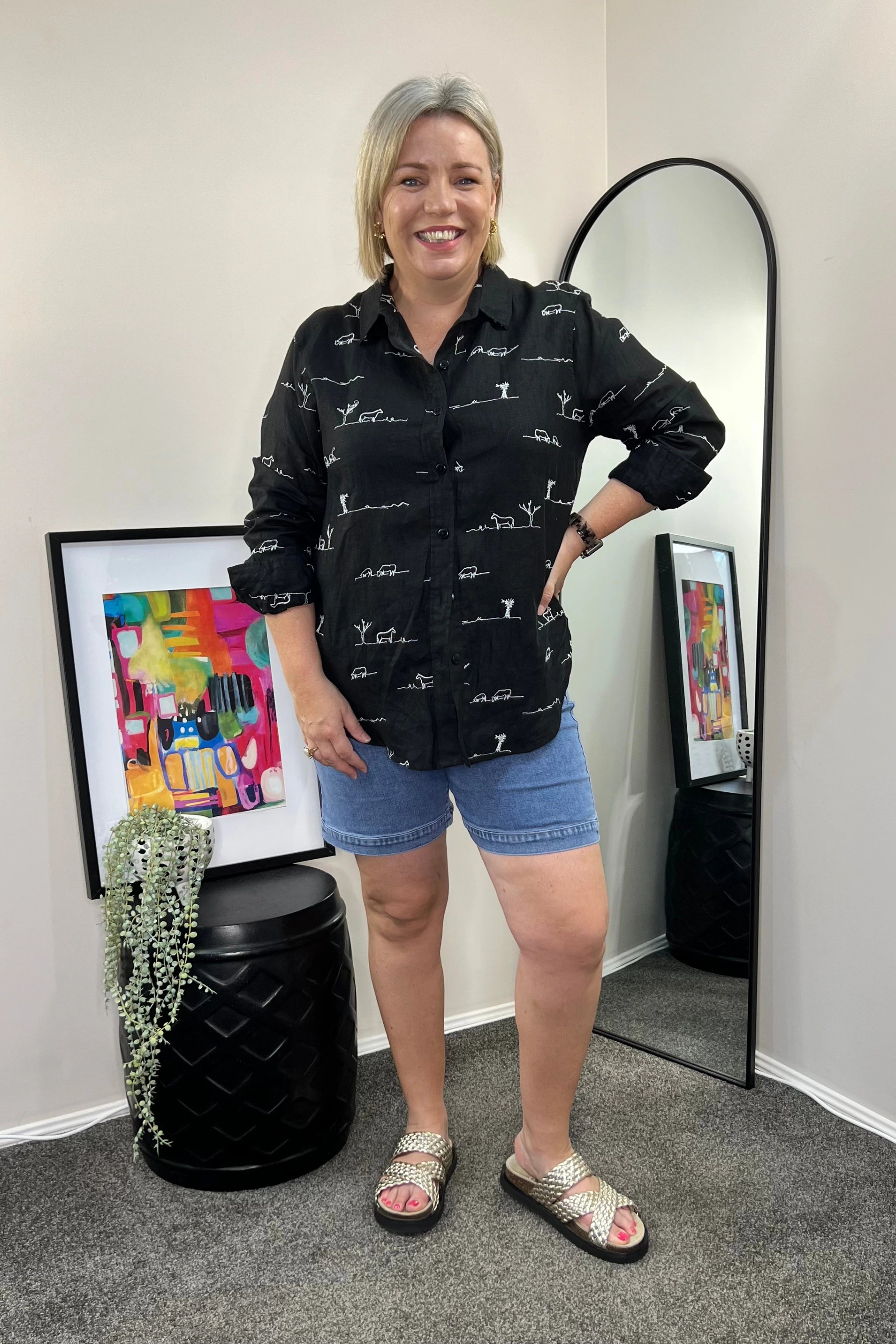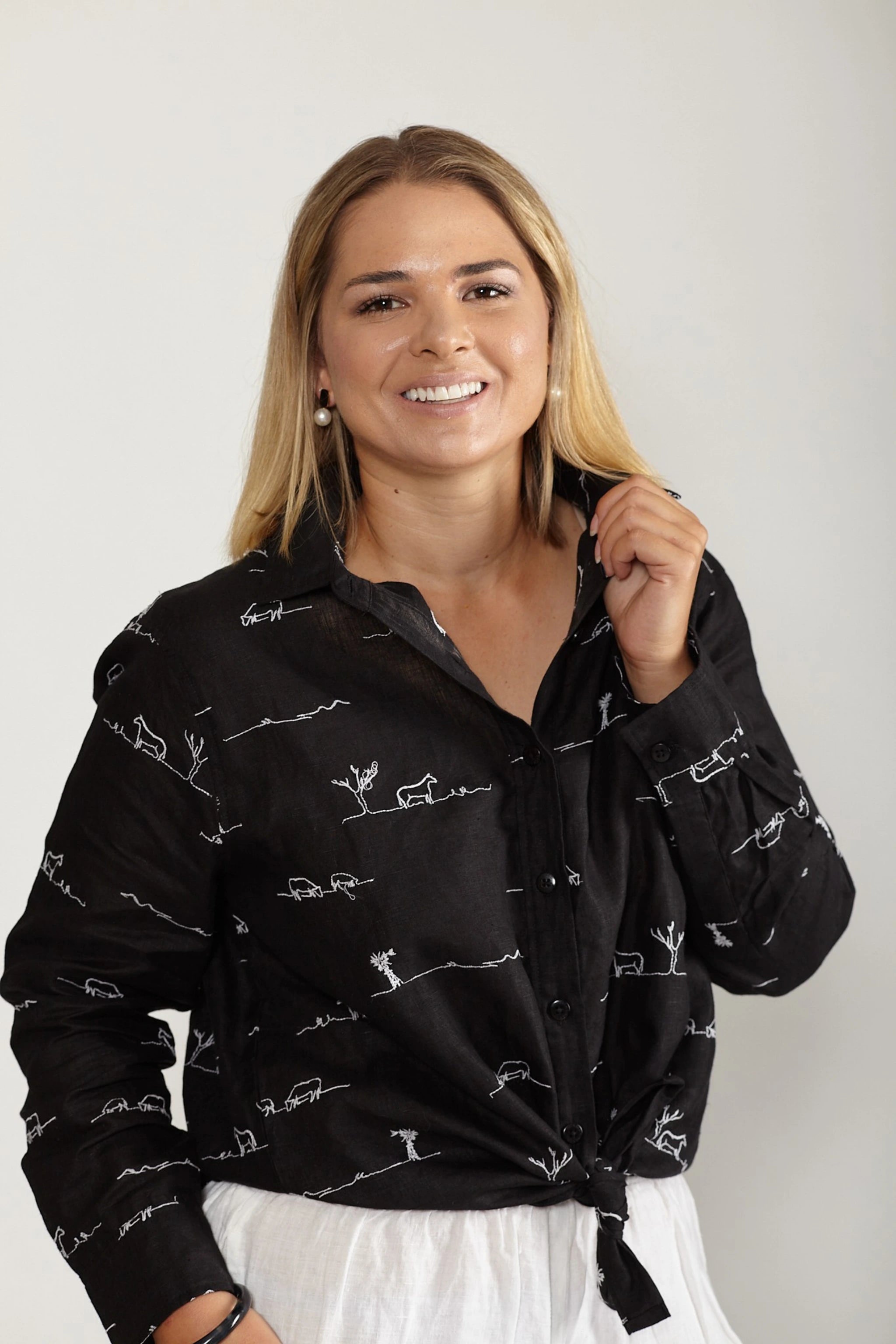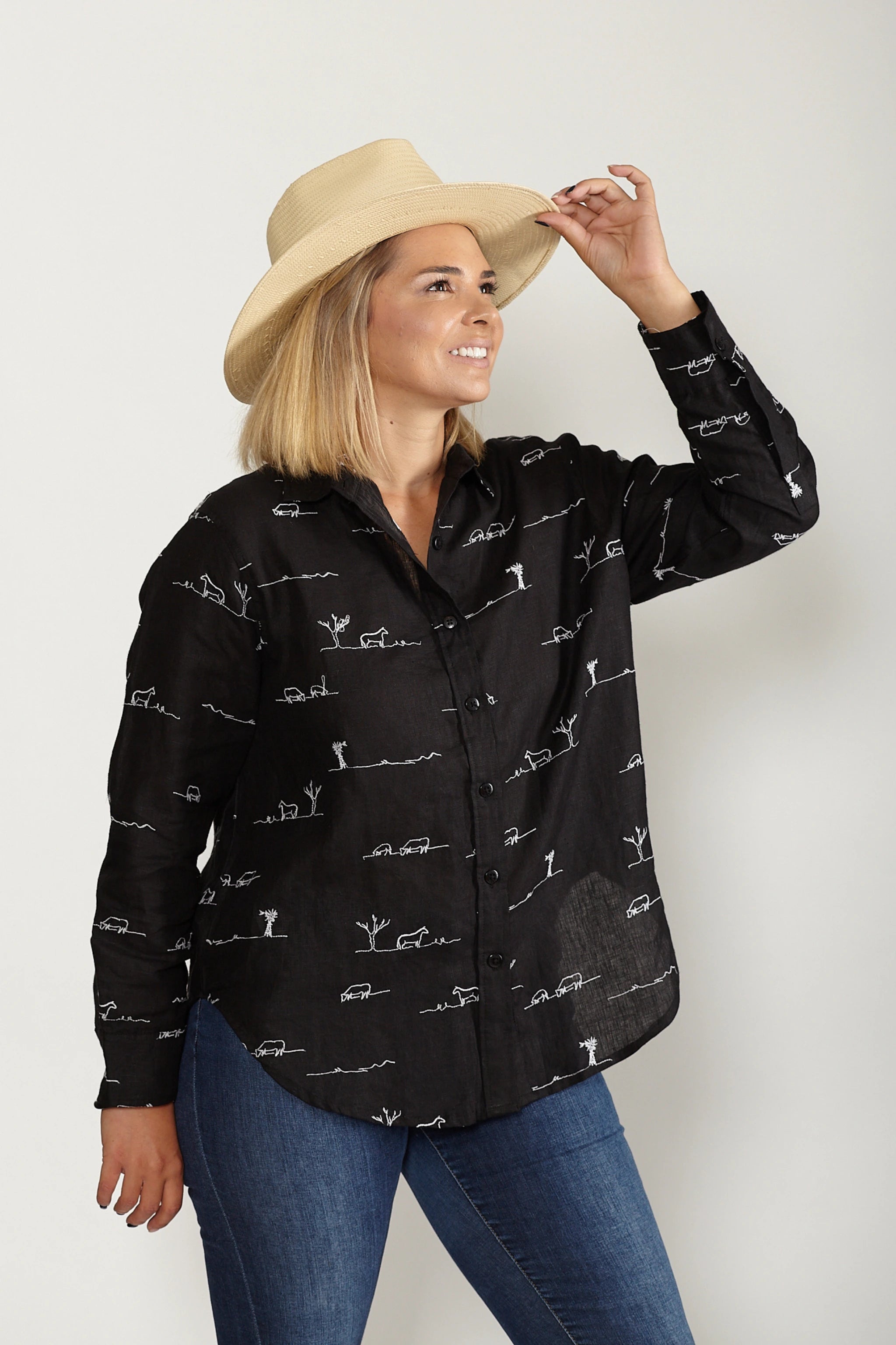 The Rural Outback Linen Shirt features original embroidery inspired by the land, cows, windmills, horses, paired with soft, breathable organic linen and a relaxed-yet-elevated fit.