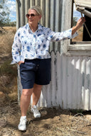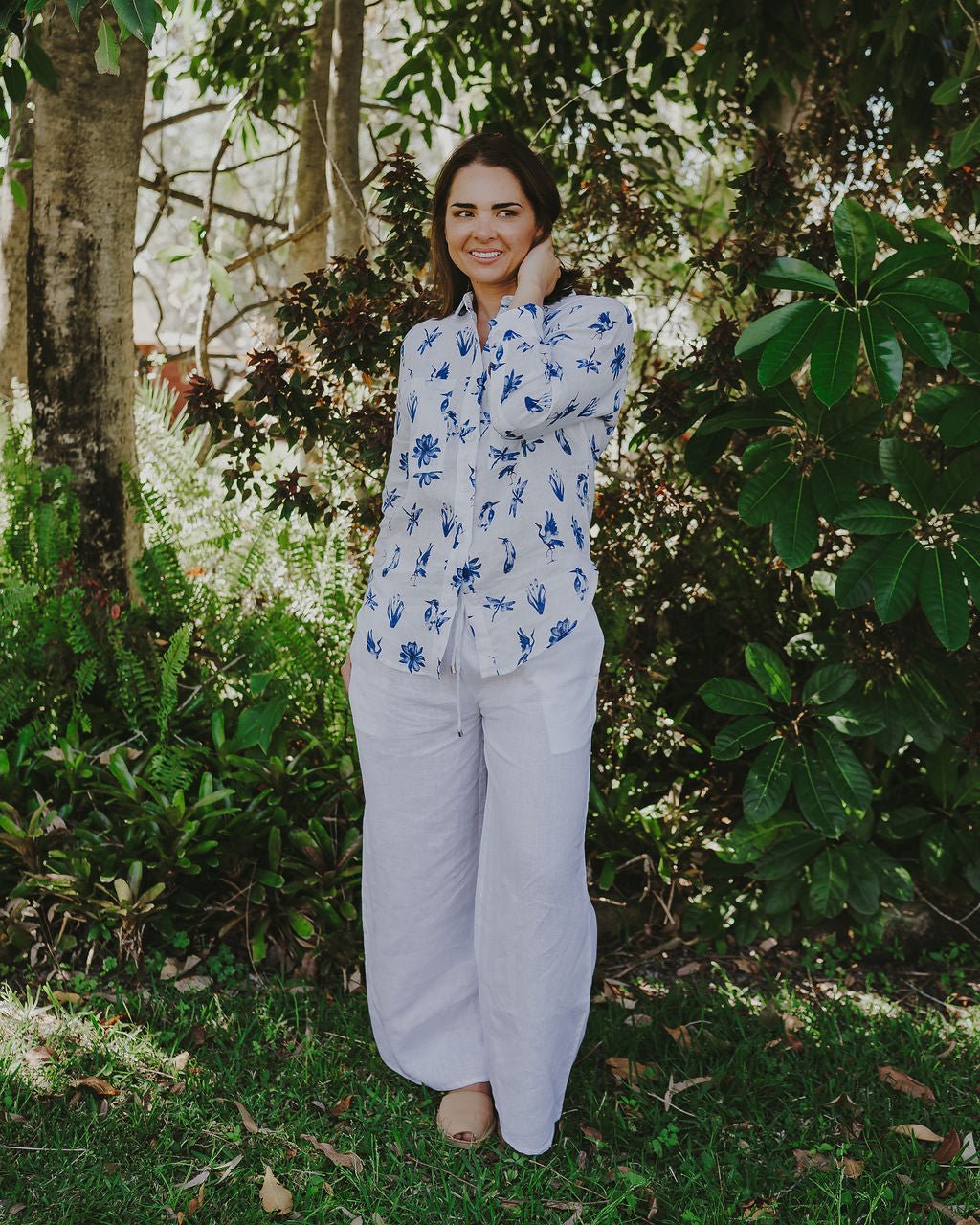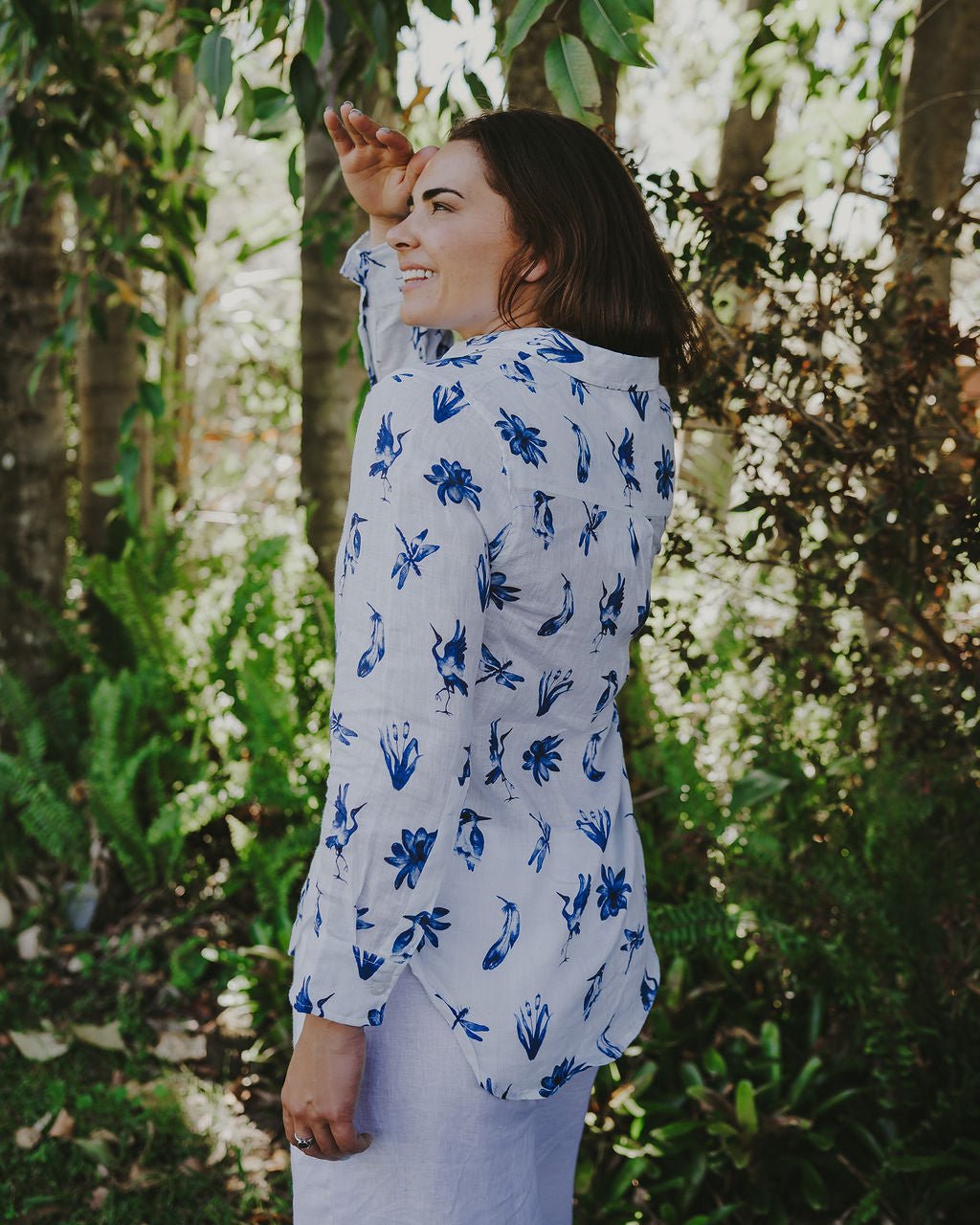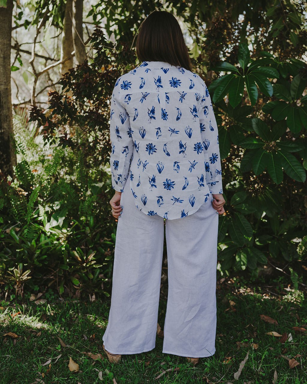 The Blue & White Bird Song Linen Shirt by Michelle Turner captures the peaceful rhythm of country mornings, the hush of dawn, the flutter of wings, and the calm before the day unfolds. Crafted from premium 100% organic linen, it brings together effortless comfort and understated elegance.