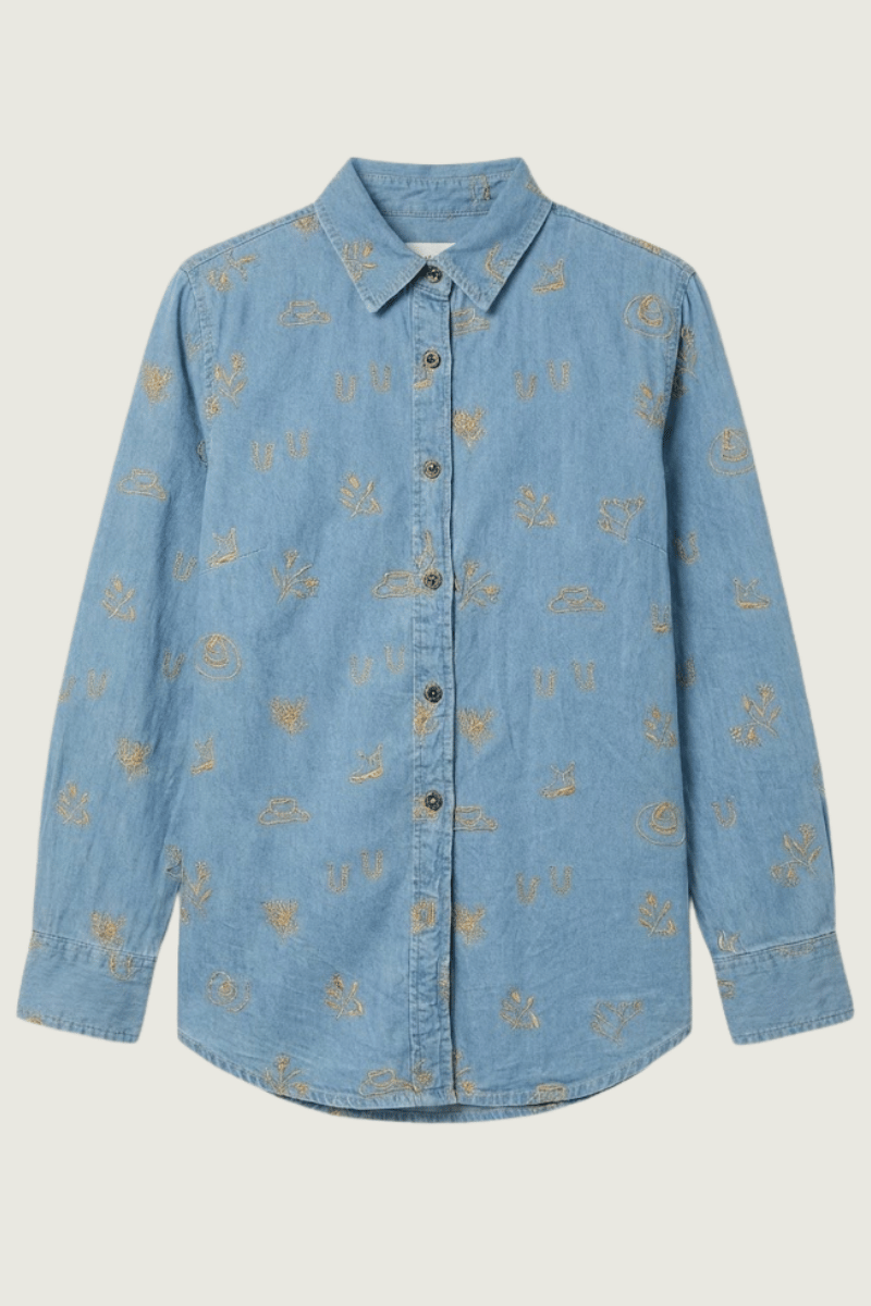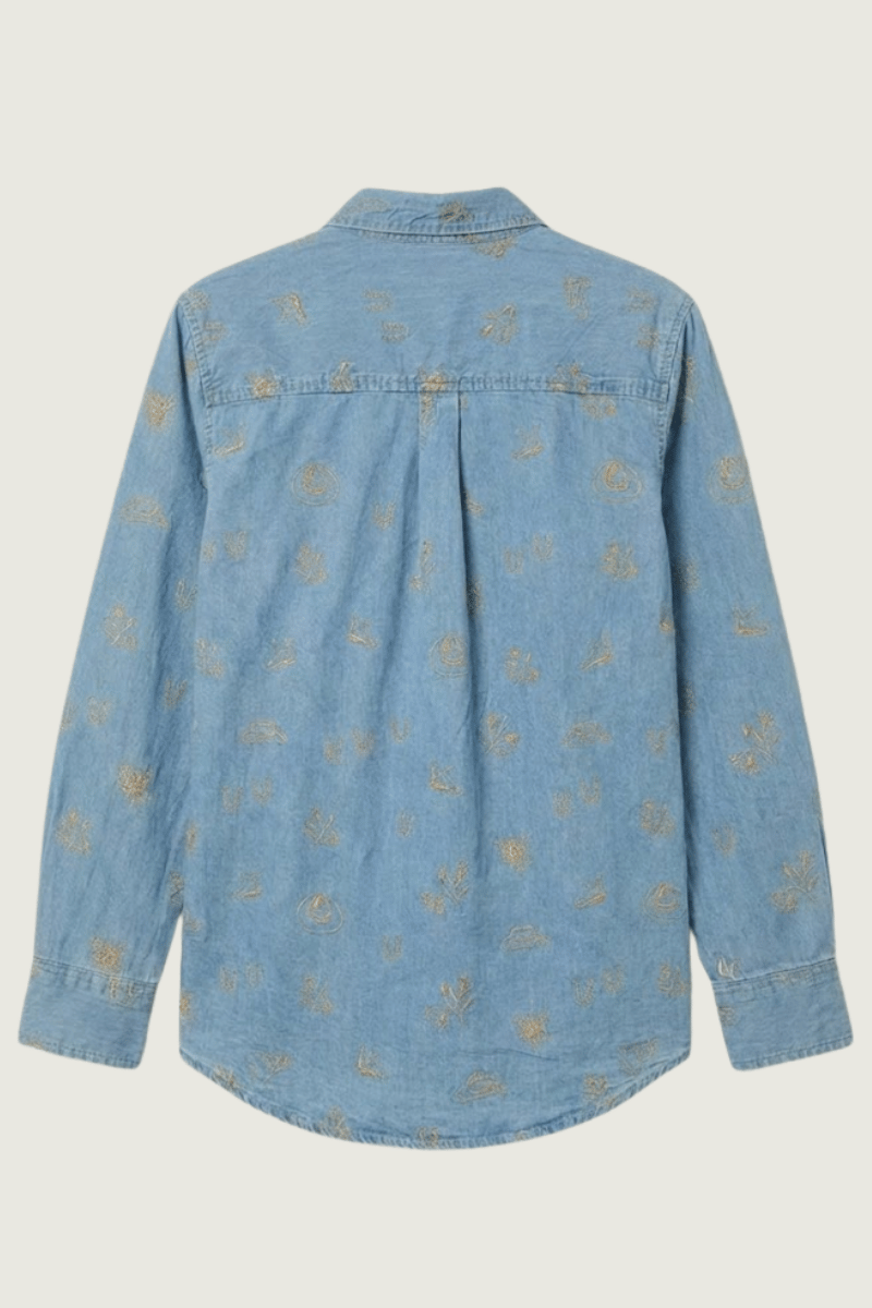 Sky Blue Denim brings a breath of fresh air to your wardrobe. Lightweight enough for warm days, polished enough for city outings, and relaxed enough for long drives with the windows down. The golden embroidery elevates the denim base with a softness and sparkle that feels like sunshine on the skin.