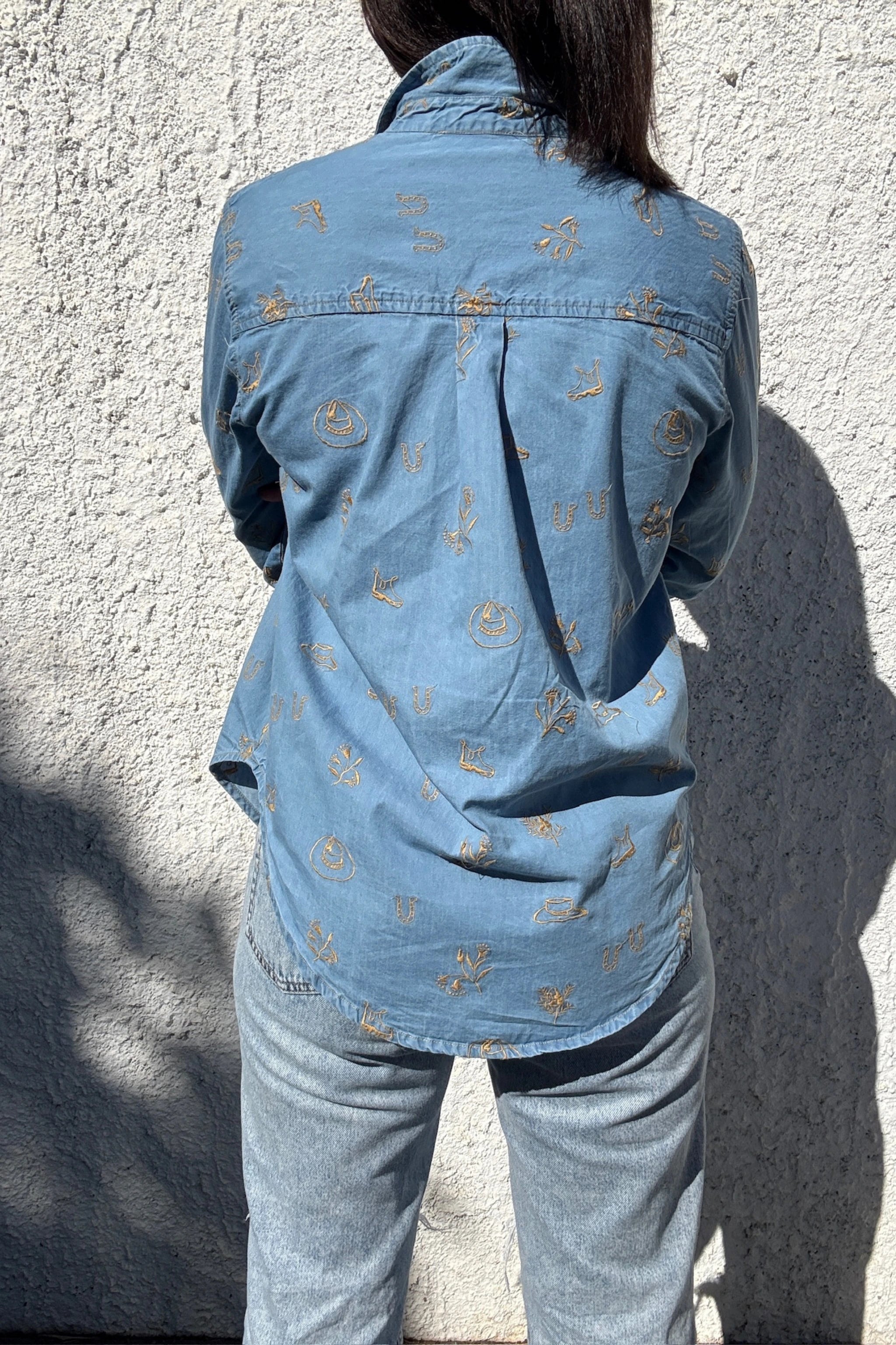 The Sky Blue Denim Lady Jane Shirt is what happens when practicality meets poetic detail. Woven from lightweight denim and finished with golden embroidery that nods to Outback life, the horses, windmills, wildflowers. She’s the modern staple for women who ride their own path.