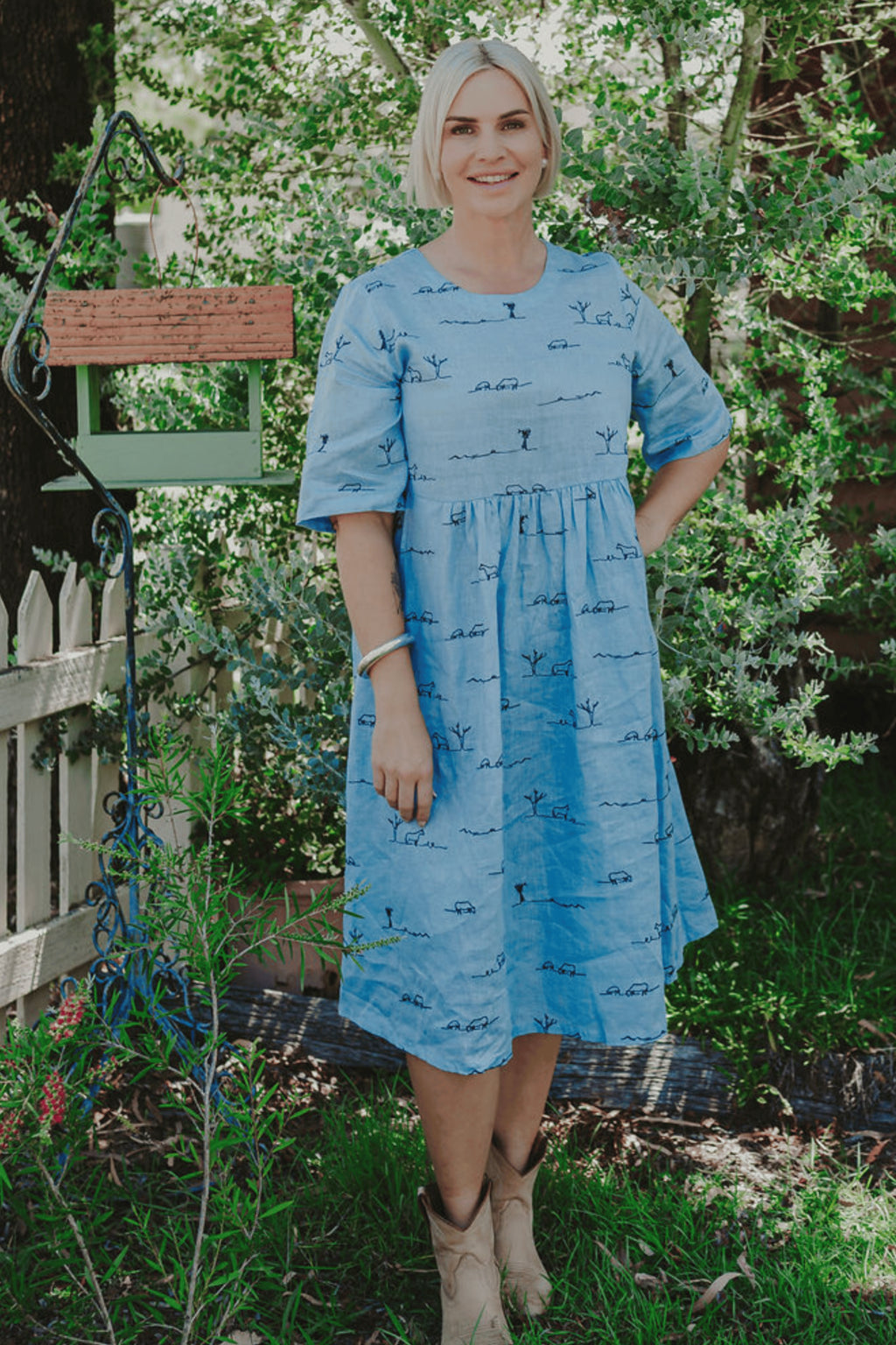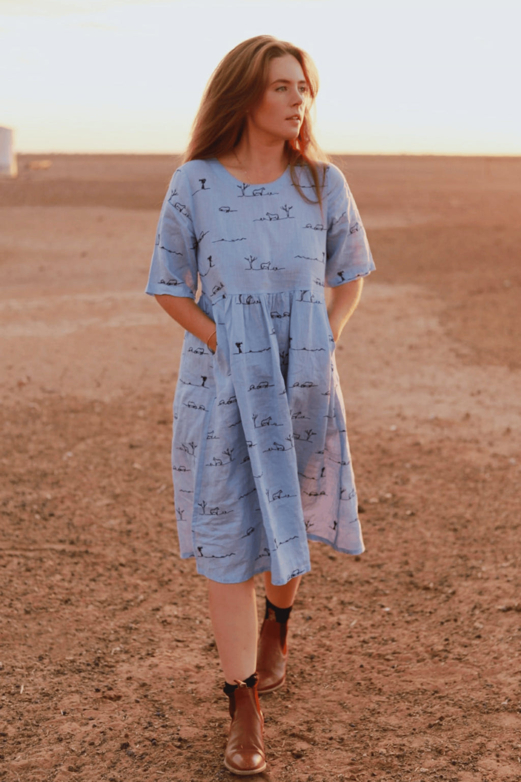 Think quiet luxury with a little outback charm. The Sky Blue Rural Outback Short Sleeve Organic Linen Dress is crafted from 100% organic linen and finished with delicate embroidery inspired by rural Australia. Lightweight, breathable and easy to throw on, it skims the figure for a softly flattering shape.