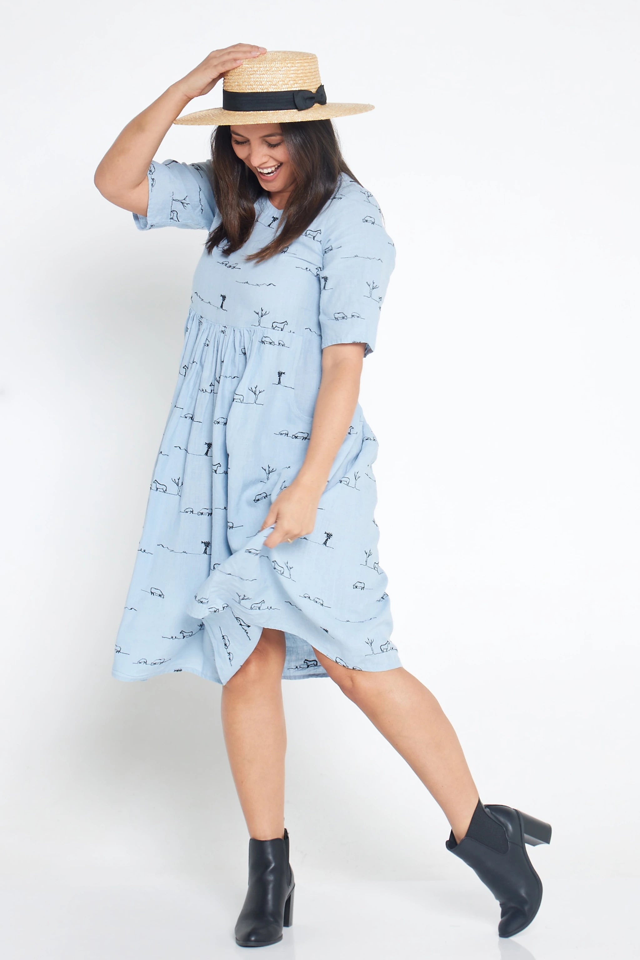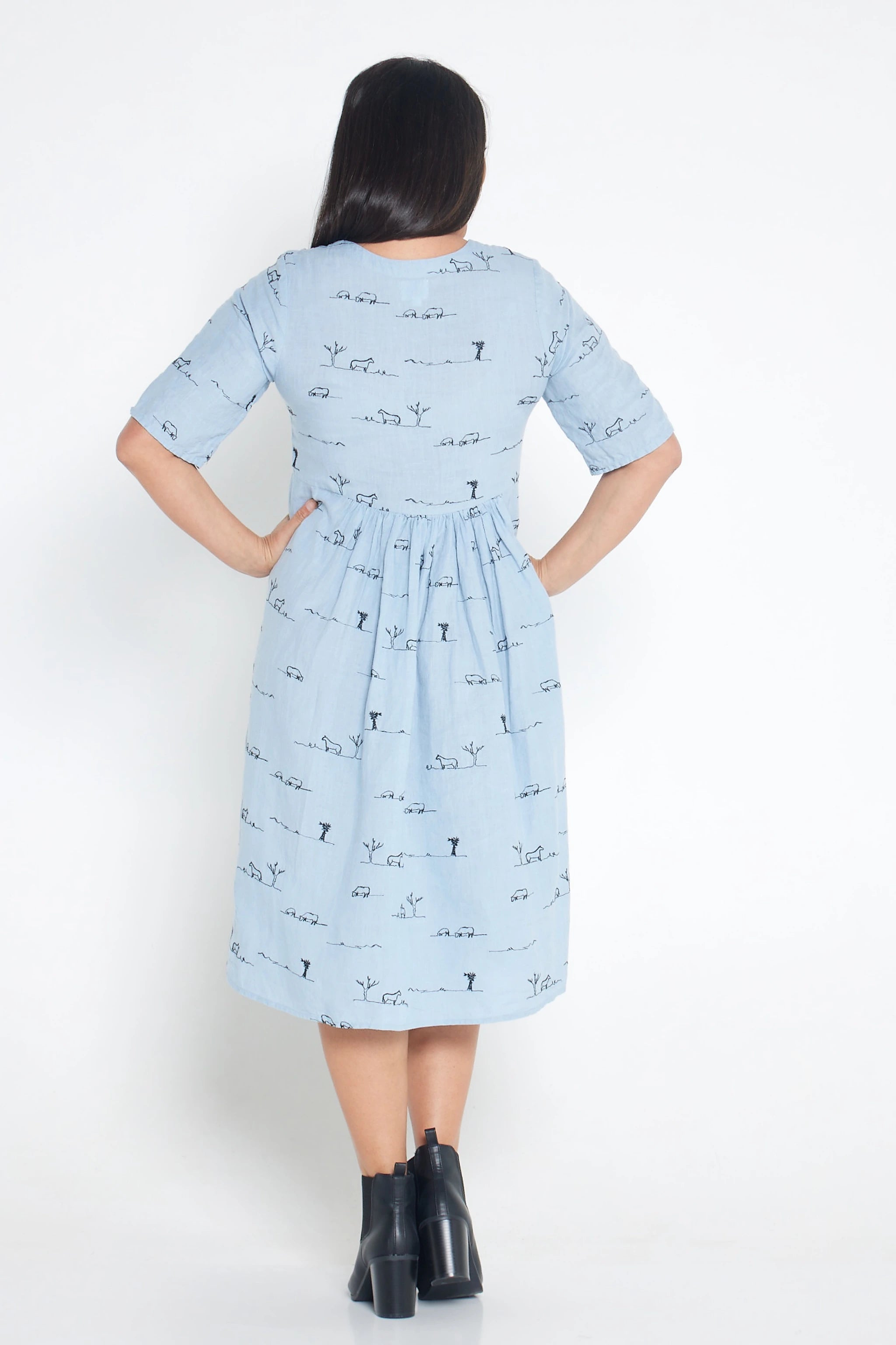 The Rural Outback Short Sleeve Organic Linen Dress blends timeless style with thoughtful craftsmanship. Inspired by the stillness of the Australian landscape, the delicate embroidery, featuring windmills, horses, and quiet rural motifs, adds meaning and artistry to an otherwise effortless silhouette.