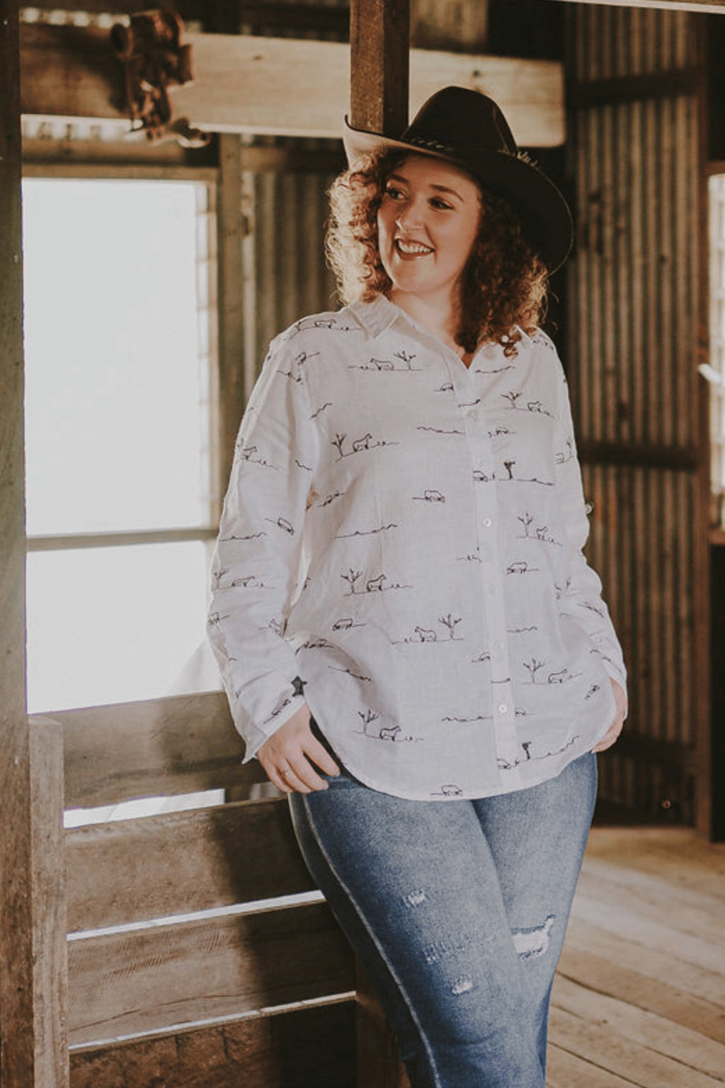 Crisp white linen, detailed embroidery and a quiet nod to life on the land. The White Rural Outback Linen Shirt showcases original motifs inspired by paddocks, cows, windmills and horses, stitched across soft, breathable organic linen with a relaxed-yet-elevated fit.