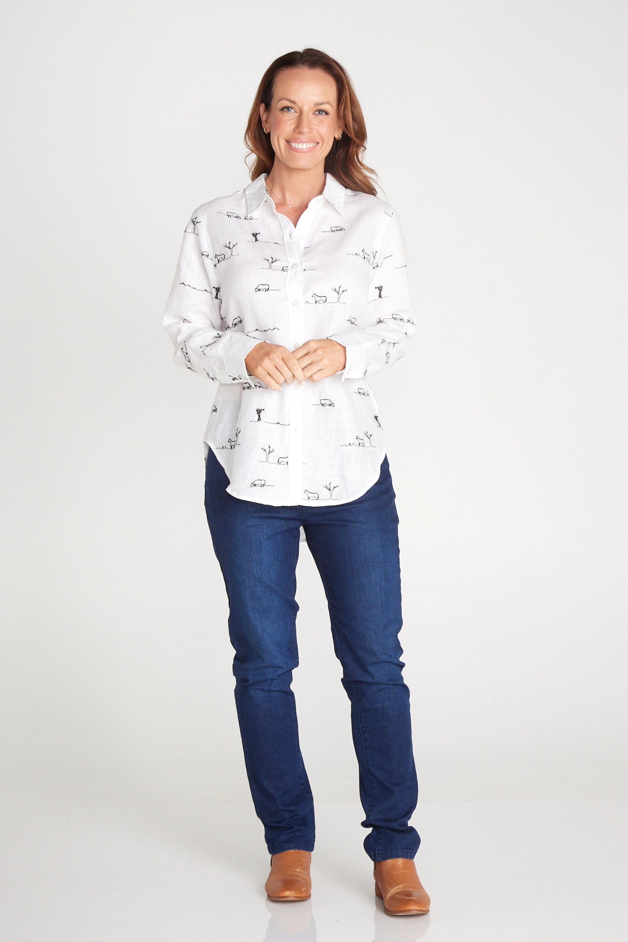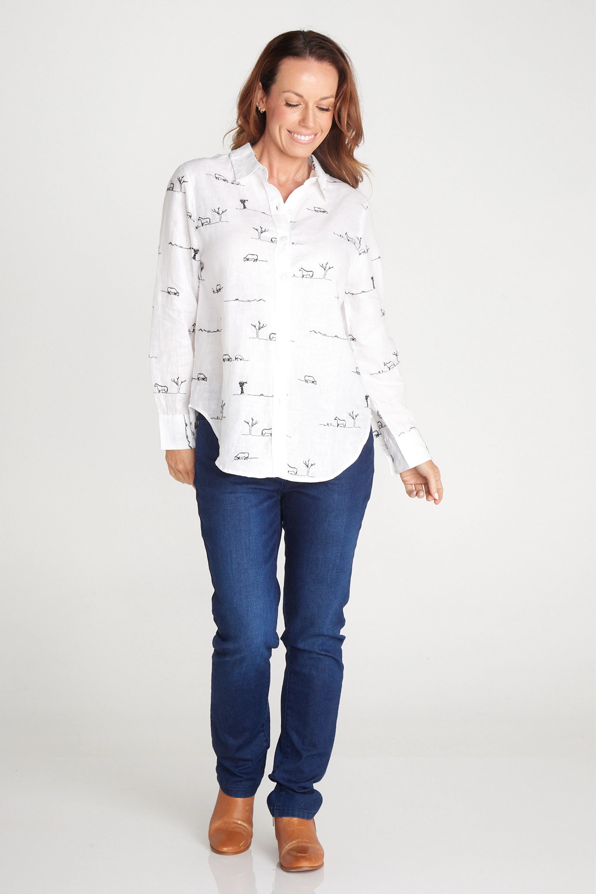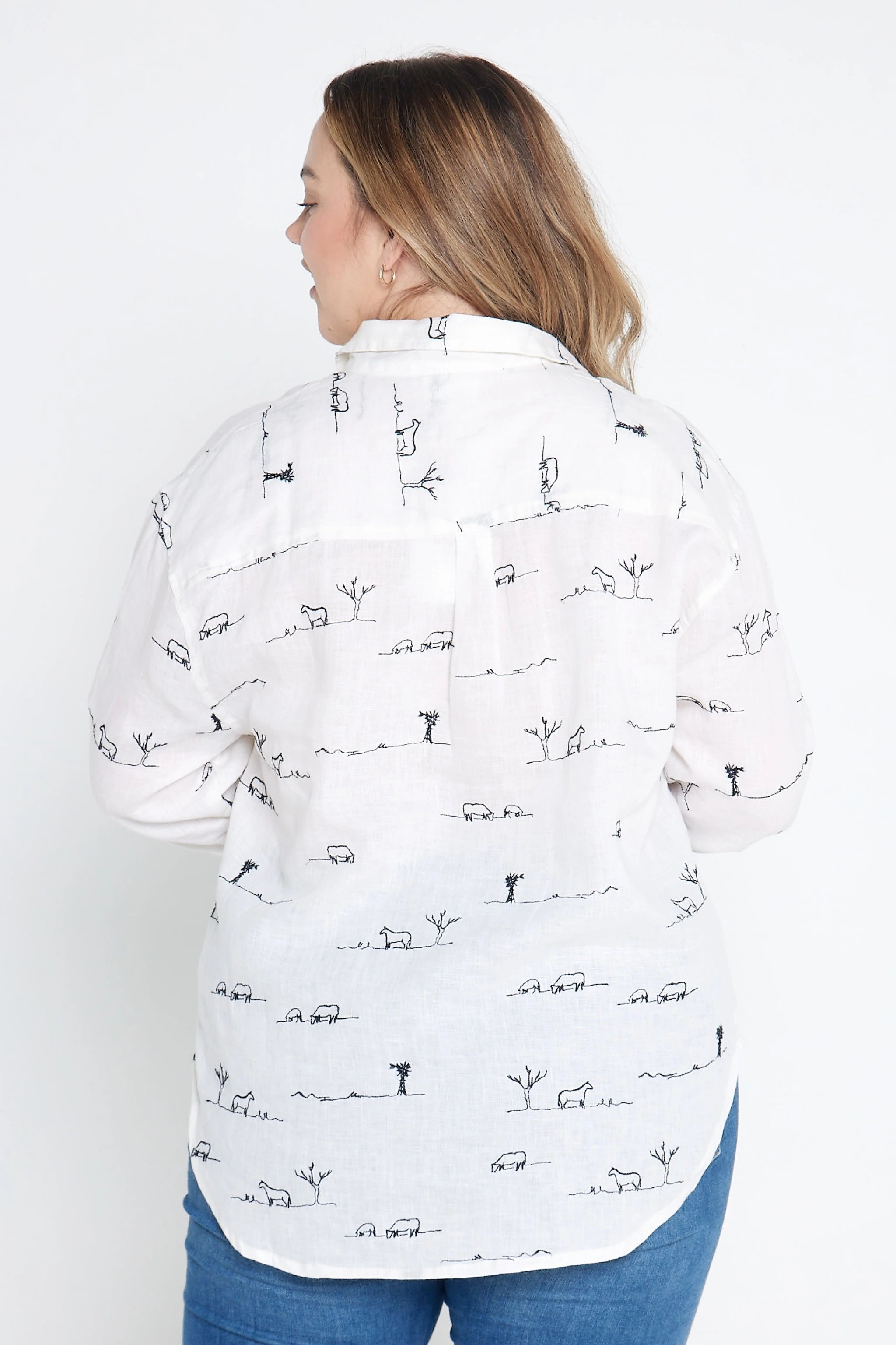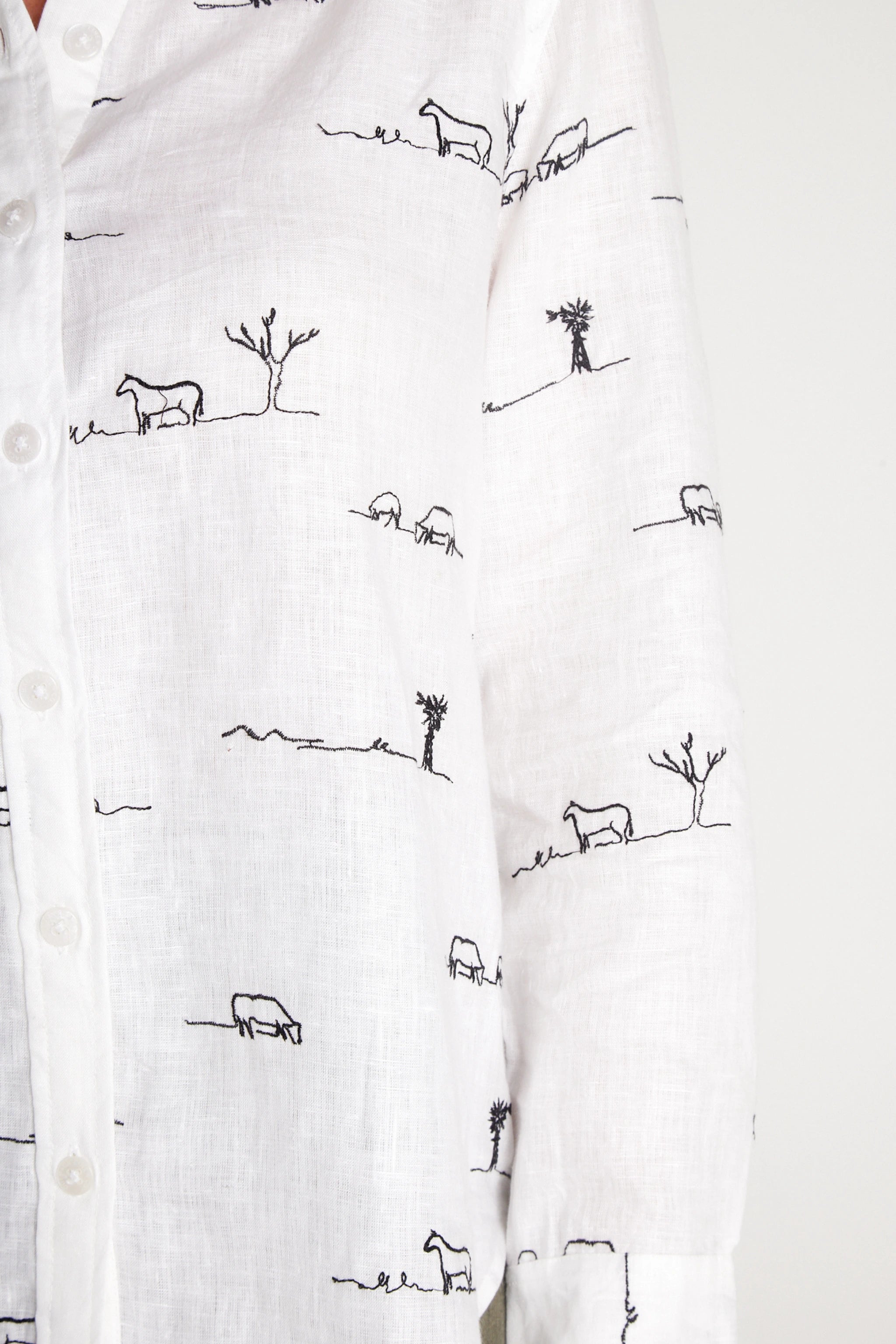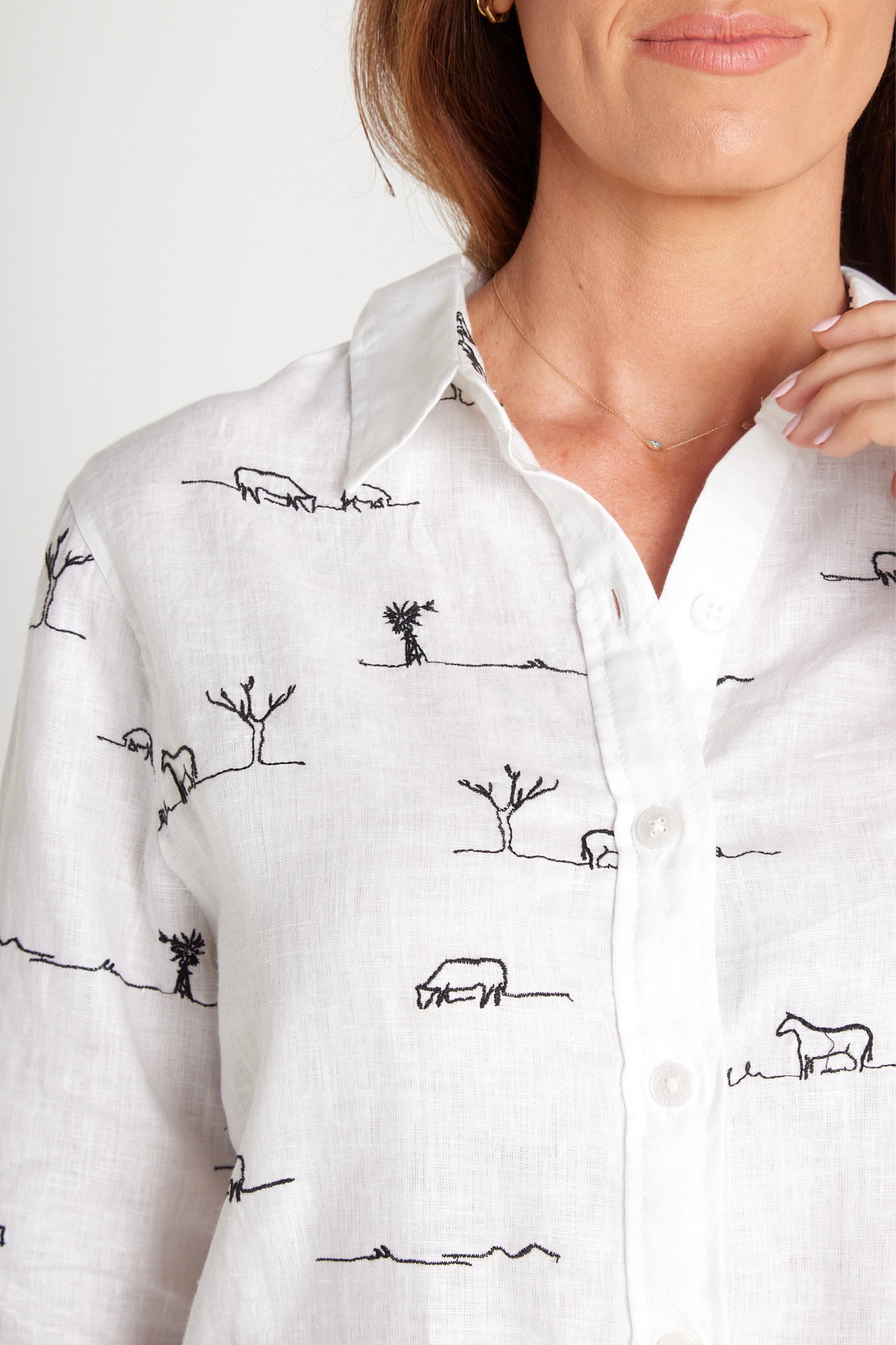 The Rural Outback Linen Shirt features original embroidery inspired by the land, cows, windmills, horses, paired with soft, breathable organic linen and a relaxed-yet-elevated fit.
